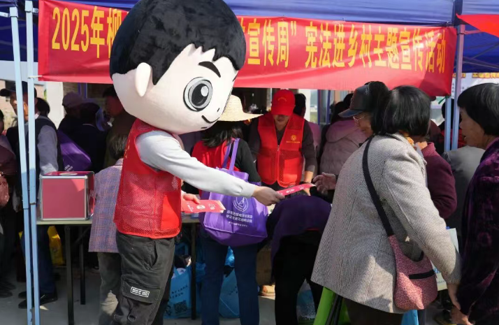 文艺表演间隙,法治有奖问答火热开锣,主持人围绕宪法基本知识设计题目,“宪法规定的公民基本权利有哪些?”“每年的几月几号为国家宪法日?”问题刚一抛出,村民们便踊跃举手、争相作答。答对的村民喜滋滋地接过法治宣传纪念品,在趣味互动中加深了对法律知识的记忆;另一边,柳州市司法局专属法治IP形象——“柳柳”和“普普”惊喜亮相,软萌可爱的人偶穿梭在人群中与村民热情互动,向村民发放普法宣传资料,让法治宣传变得更加亲切可感。
