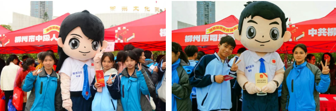 活动现场还进行了《铜鼓敲出壮乡情》《宪法为灯 法治为盾》《一起学习法治宣传教育法》《五星红旗迎风飘扬》等法治节目展演。有奖问答环节,柳州市司法局新升级设计的普法IP形象——“柳柳”和“普普”也以视频和人偶的形式与大家见面和互动。
