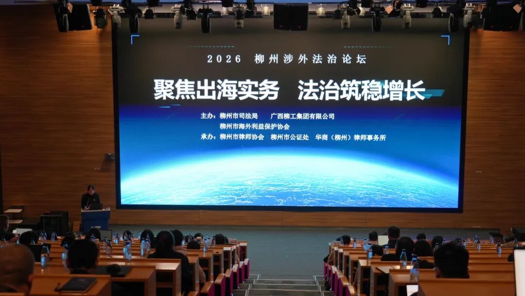 法治护航,柳企扬帆。1月30日,2026年第一期柳州涉外法治论坛在广西柳工机械股份有限公司全球研发中心报告厅圆满举办。本次论坛以“聚焦出海实务 法治筑稳增长”为主题,由柳州市司法局、广西柳工集团有限公司、柳州市海外利益保护协会联合主办,柳州市律师协会等单位承办,140余名政企学研及法律界代表齐聚一堂,共话涉外法治建设、共商出海发展良策,为柳州企业开拓海外市场、聚力向海图强搭建起涉外法治交流平台,有力筑牢法治屏障。