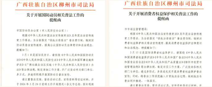 近日,柳州市司法局向市国动办、市市场监督管理局发出2026年度《普法工作的提醒函》,提醒利用好“3·1”国际民防日、“3·15”国际消费者权益保护日的时间节点,认真落实“谁执法谁普法”普法责任制,开展全民国防动员、消费者权益保护相关普法宣传活动,进一步深化国防动员领域和消费者保护领域法治宣传教育。同时,要求相关单位将普法工作深度融入日常执法全过程,做到执法与普法同步推进、一体落实。