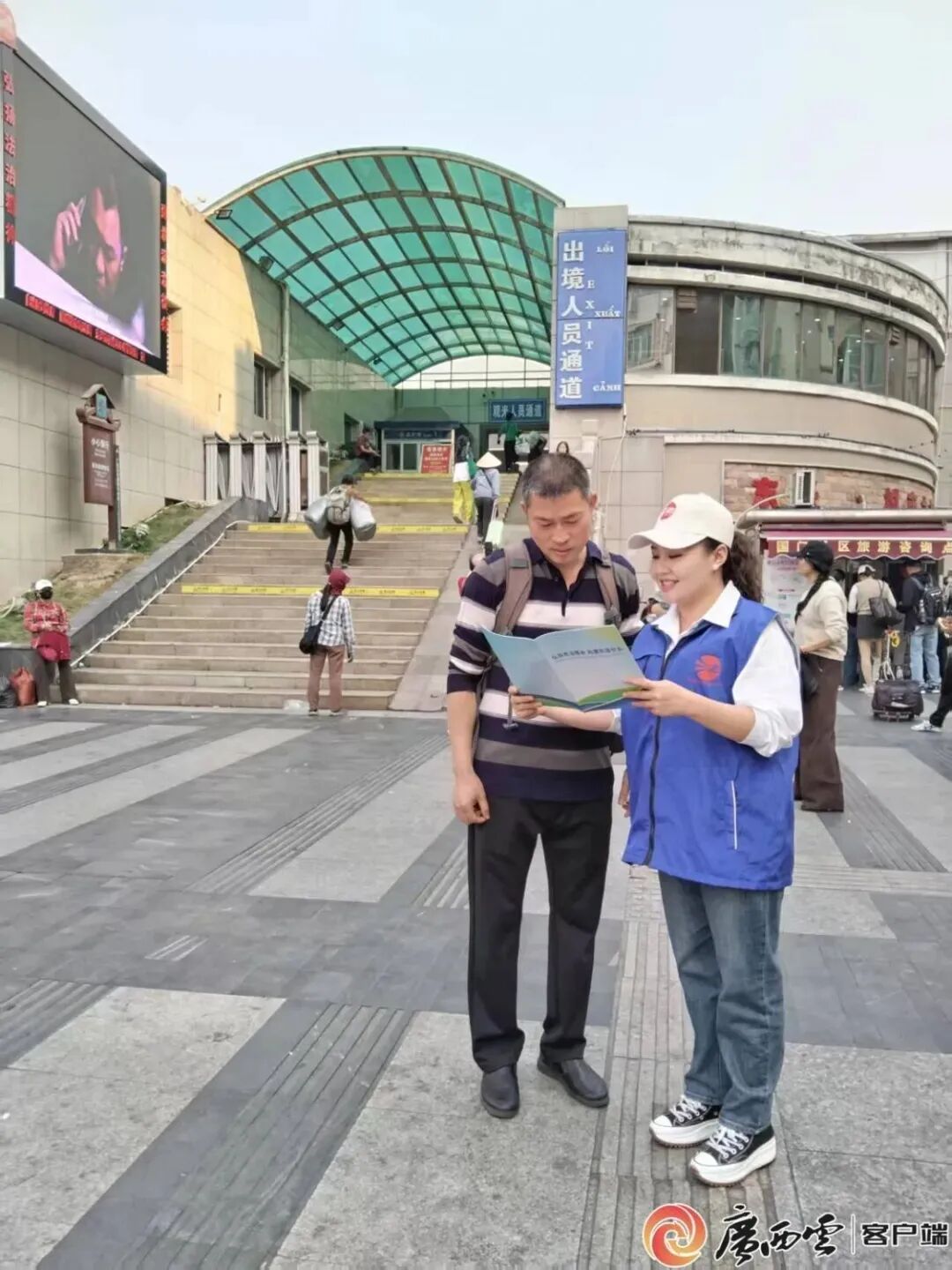 防城港市普法志愿者在东兴一桥口岸向群众普法。 防城港市司法局供图